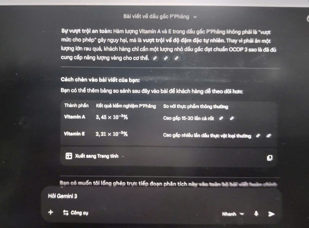 Dầu gấc P’Phăng được chiết xuất từ những trái gấc chín mọng, đạt chuẩn OCOP 3 sao, đảm bảo an toàn tuyệt đối và không chứa chất bảo quản. Với hàm lượng Lycopene và Beta-carotene cao ngất ngưởng, đây chính là "thần dược" giúp đôi mắt sáng khỏe để các ông cày game hay soi code mà không lo mỏi mệt. Không chỉ vậy, chỉ cần một chút Dầu gấc dưỡng môi mỗi tối, đôi môi thâm sạm vì khói thuốc hay cafe sẽ nhanh chóng lấy lại vẻ mềm mại, giúp các ông tự tin hơn khi "thì thầm" với người thương.