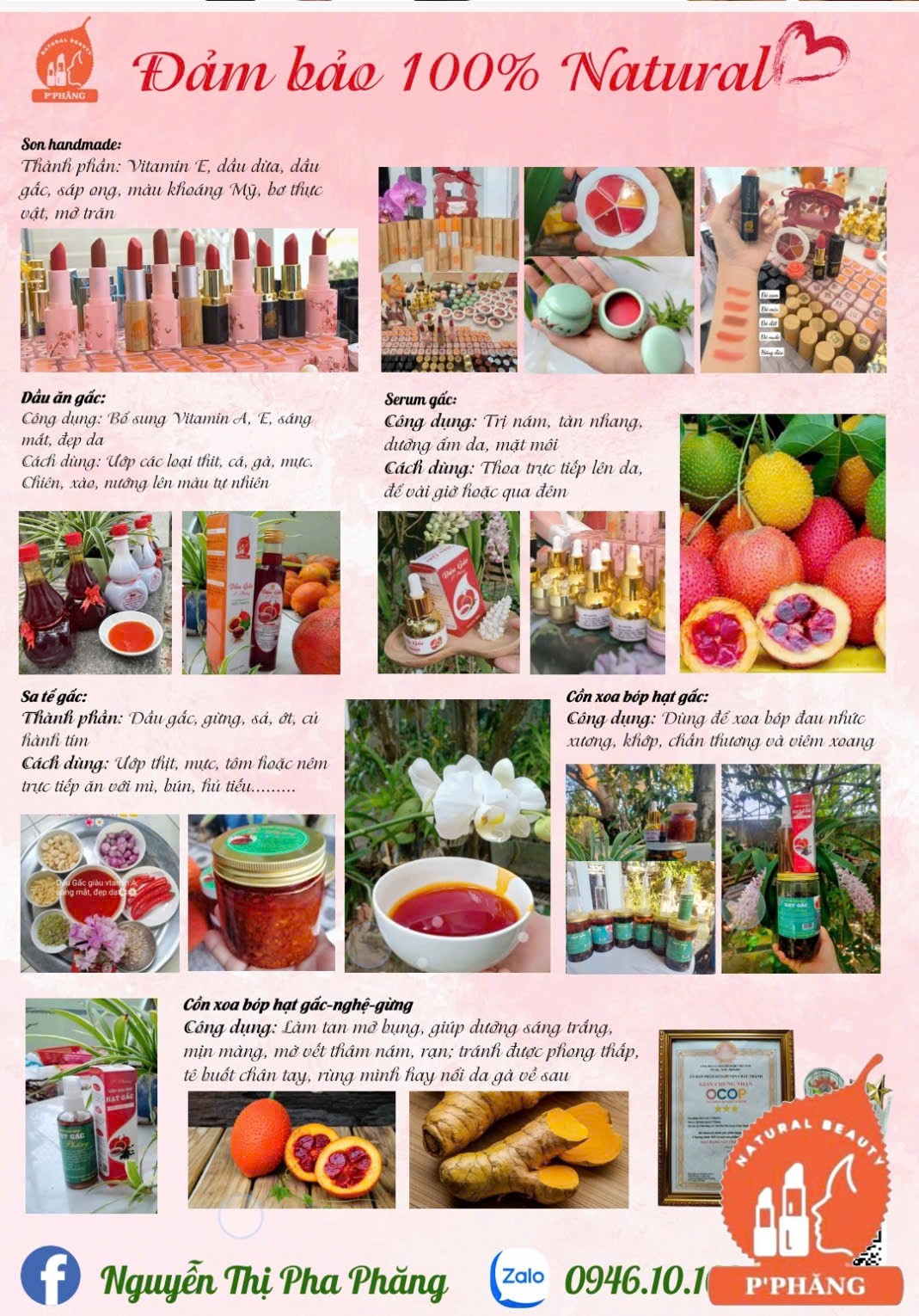 Từ những trái gấc chín đỏ mọng, P’Phăng đã tạo ra đa dạng các Sản phẩm từ gấc như dầu gấc, kem dưỡng, cho đến các loại thực phẩm như đá me ngào gấc, nước cốt gấc. Mỗi sản phẩm là một lời cam kết về chất lượng, là tâm huyết của những người nông dân và đội ngũ P’Phăng. Sử dụng Mỹ phẩm thiên nhiên từ gấc là bạn đang ủng hộ một lối sống xanh, bền vững và nhân văn.
