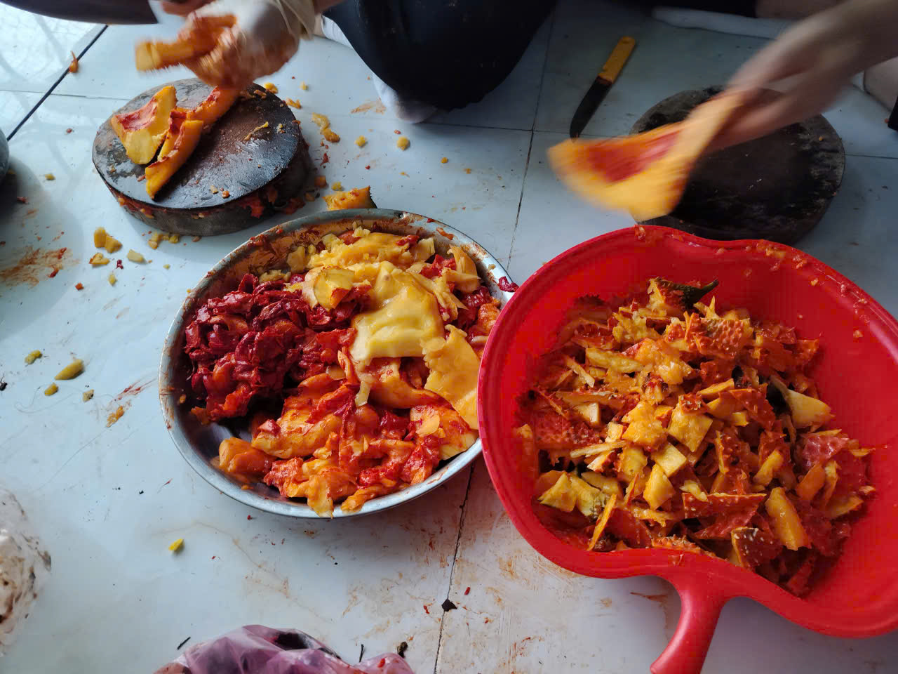 Quy trình ủ phân từ vỏ gấc tại P’Phăng vô cùng đơn giản nhưng hiệu quả. Vỏ gấc sau khi băm nhỏ sẽ được trộn cùng các loại men vi sinh, giúp chuyển hóa các chất xơ thành dinh dưỡng dễ hấp thụ cho cây trồng. Phương pháp này không chỉ giúp giảm thiểu tác động đến môi trường mà còn tạo ra nguồn phân bón sạch, giúp tái tạo độ phì nhiêu cho đất, phục vụ cho những mùa gấc xanh tươi tiếp theo.