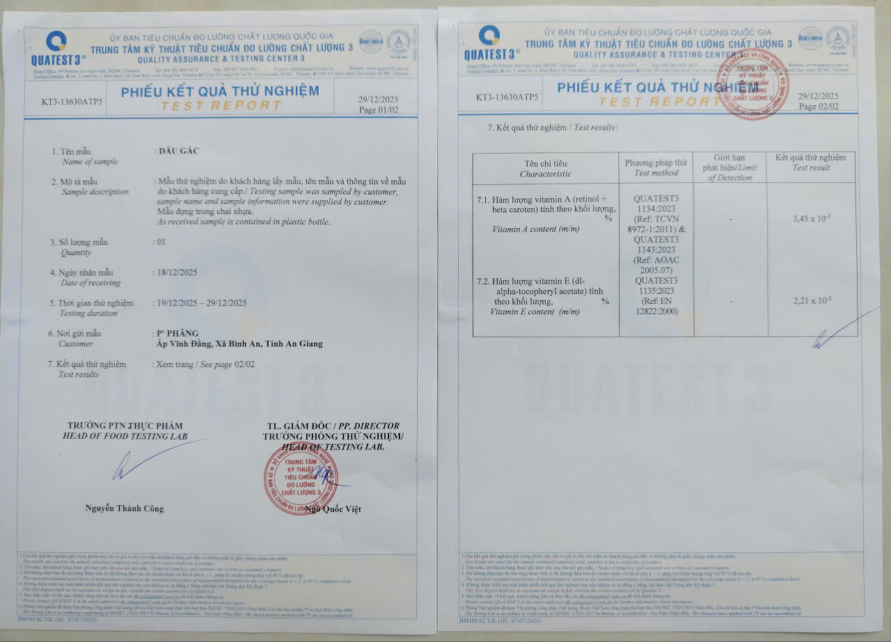Dầu gấc P’Phăng với hàm lượng Vitamin A, E vượt trội giúp sáng mắt, đẹp da và tăng cường sức khỏe. Sản phẩm đạt chuẩn OCOP 3 sao, an toàn cho cả người già và trẻ nhỏ, là gia vị tuyệt vời cho mọi món ăn gia đình.